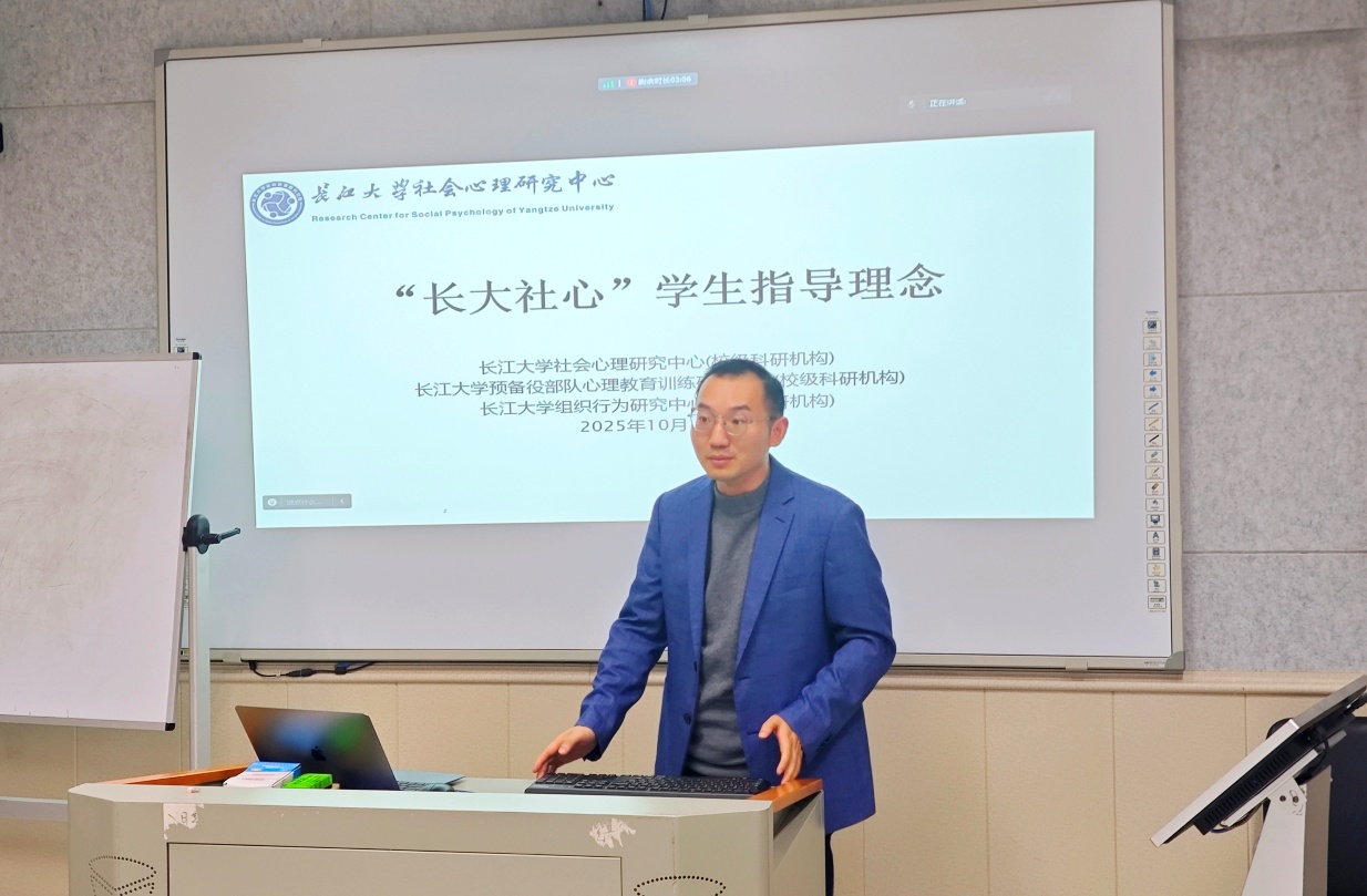 汇报结束后,严磊老师介绍了《长江大学社会心理研究中心的学生指导理念》,从中心简介、学生学业规划、学生指导理念等三个方面对各位同学的学习和生活提出了总体规划,严老师强调了研究生和本科生的培养目标,要求大家在学术能力、专业实践能力和综合素质这三个方面不断提升。