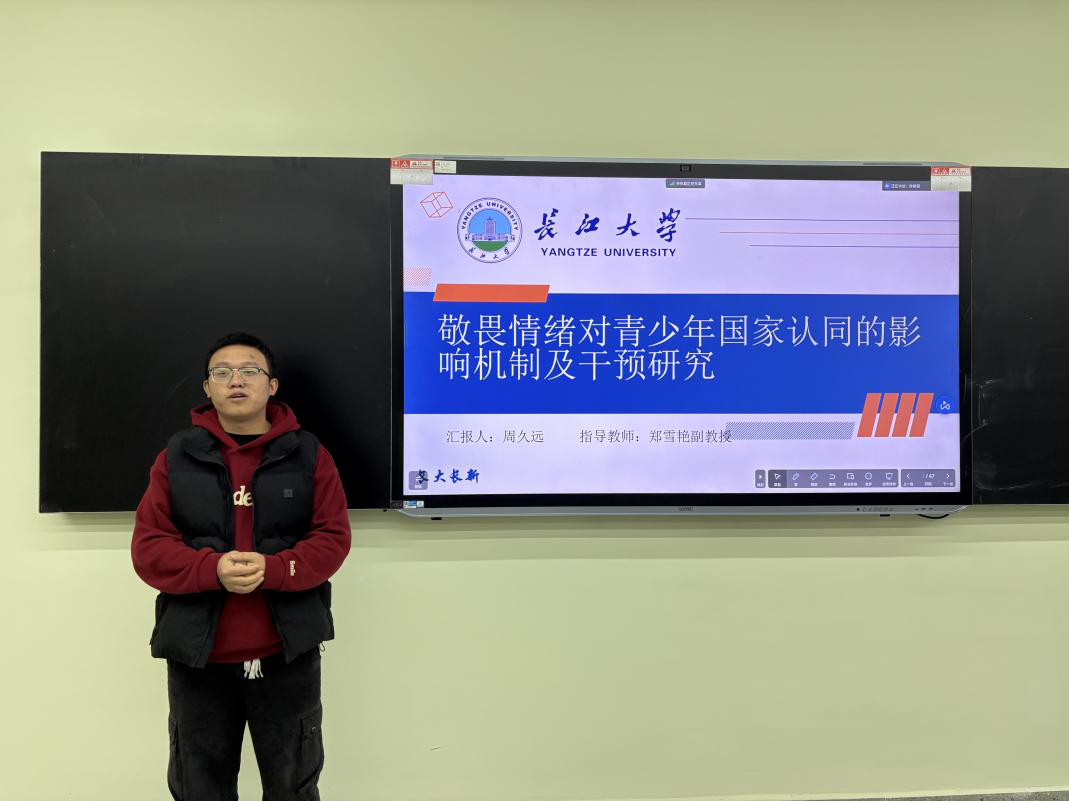 首先,周久远同学进行了毕业论文预答辩,其论文题目为《敬畏情绪对青少年国家认同的影响机制及其干预研究》。