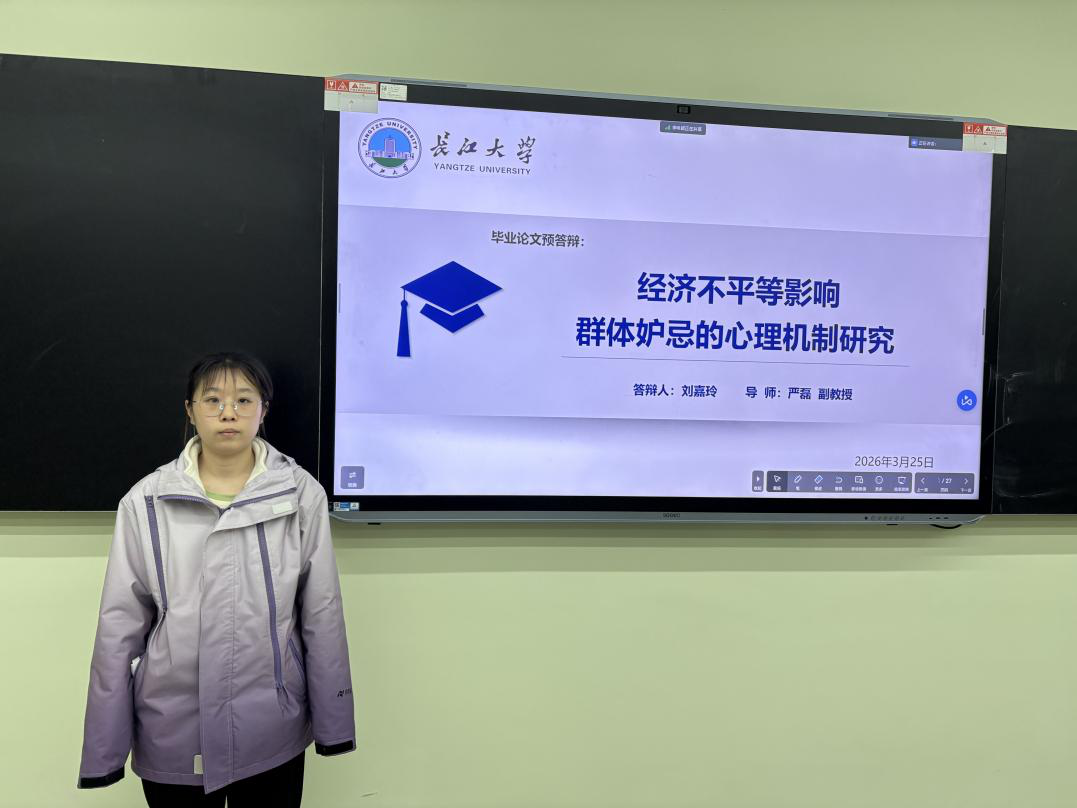 其次,刘嘉玲同学进行了毕业论文预答辩,其论文题目为《经济不平等影响群体妒忌的心理机制研究》。