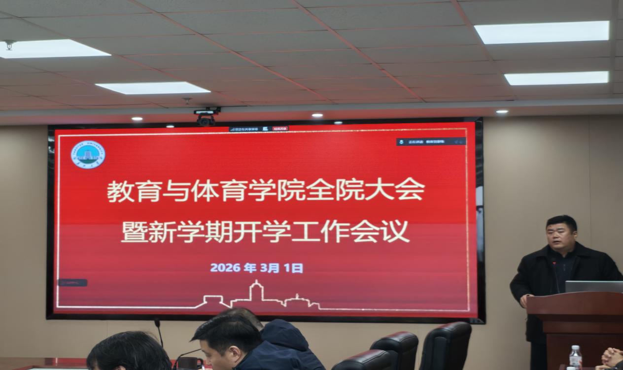 【通讯员 何诗瑶】春潮涌动启新程, 奋楫扬帆正当时。为深入学习贯彻学校新学期会议精神, 统筹部署学院2026年春季学期各项重点工作, 凝聚全院教职工奋进力量, 3月1日上午9时, 教育与体育学院在文科楼905会议室召开全院大会暨新学期开学工作会议。学院党委书记于永伟主持会议,全院教职工参加会议。