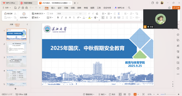 (通讯员:罗光彩)为切实做好国庆、中秋假期学生安全工作,增强学生安全意识,保障学生度过一个平安、愉快的假期,2025年9月25日晚19:00我院研究生分班组织开展了国庆、中秋假期安全教育线上主题会议。