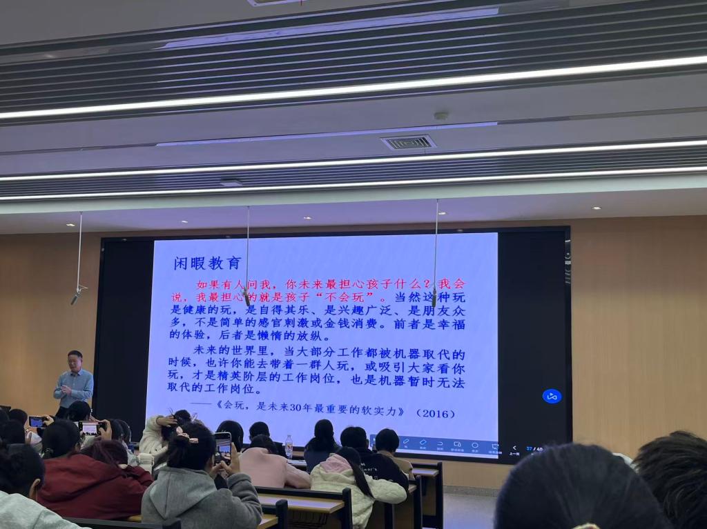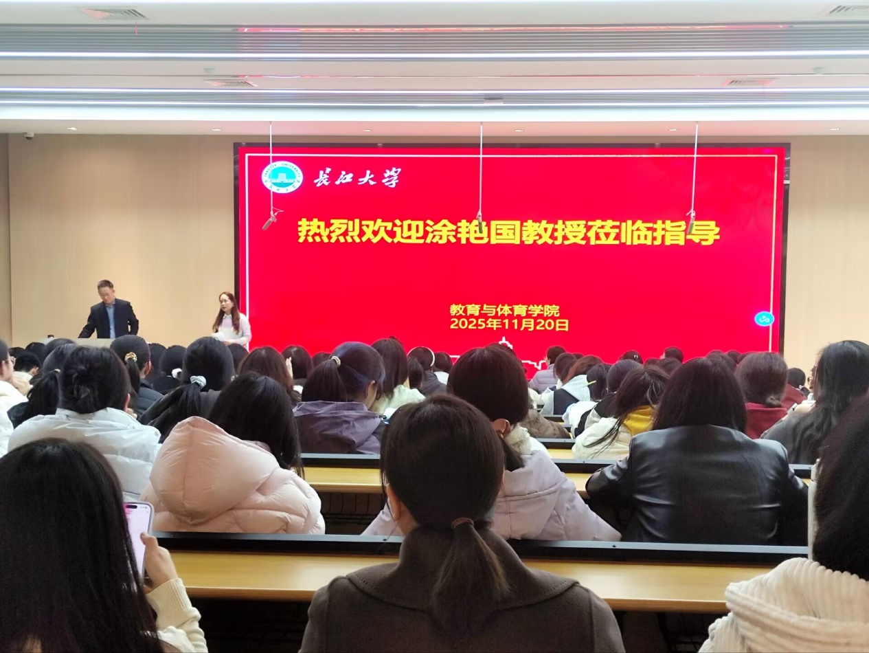 (通讯员 刘琦)2025年11月20日14:00,16教A109智慧教室座无虚席,一场以“智能时代教育新生态”为主题的精彩讲座如期举行。华中师范大学教育学院涂艳国教授担任主讲人,其中“儿童解放与教育变革”是本次讲座的核心议题。报告会由教育与体育学院院长张艳红主持,教育学专业本科生、研究生及教育系全体教师共计160余人聆听报告。