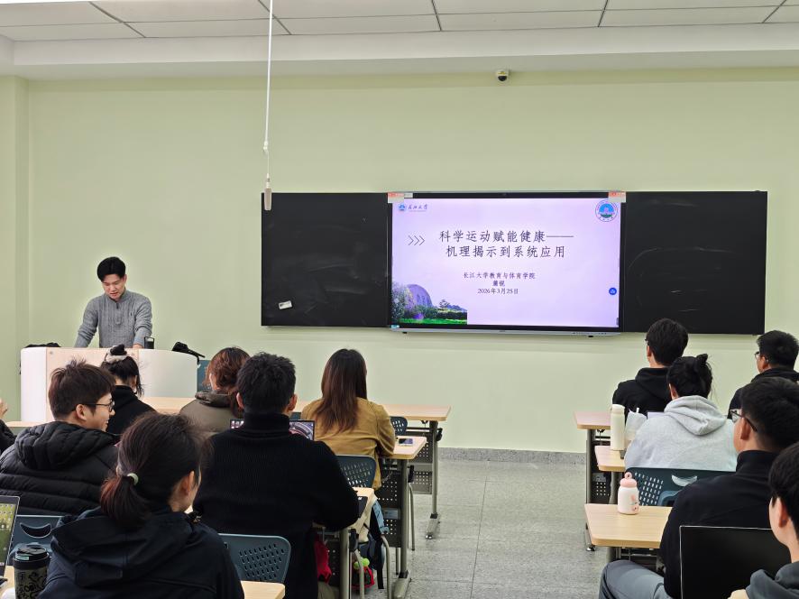 (通讯员 陈逸飞)为进一步浓厚我院研究生学术氛围,助力学生树立科学健康理念、拓宽学术研究视野,2026年3月25日,长江大学教育与体育学院求实导师学术沙龙系列专场活动在16教A区103智慧教室顺利举行。我院蒲锐老师以“科学运动赋能健康:机理解释到系统应用”为主题开展专题主讲,为到场的体育类研究生带来了一场兼具学术深度与实践价值的精彩分享,现场学生认真聆听、积极互动,学术氛围十分浓厚。