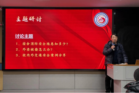在主题研讨环节中,参会人员展开了深入交流,围绕宿舍消防演练、反诈宣传及校内外交通安全等议题展开了热烈讨论。学生干部们结合亲身经历踊跃发言,积极分享见解并提出建议,现场讨论氛围浓厚,展现了高度的责任感与主动担当的精神。