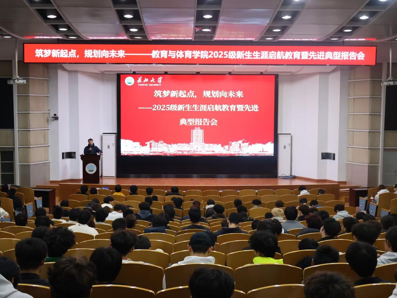 【通讯员 曾杉 杨雅月/文 谷世家 唐鑫/摄】为帮助2025级新生明确大学目标、规划成长路径,11月7日晚19时许,教育与体育学院2025级新生生涯启航教育暨先进典型报告会在12教405报告厅举行。本次会议由兼职辅导员金楚悦主持,学生就业工作处处长徐波、学院党委书记于永伟、院长张艳红、副院长杨青宝、宋永晶、汪阳帆、党委副书记何可可、院长助理严磊以及优秀学生代表、2025级全体新生参与。